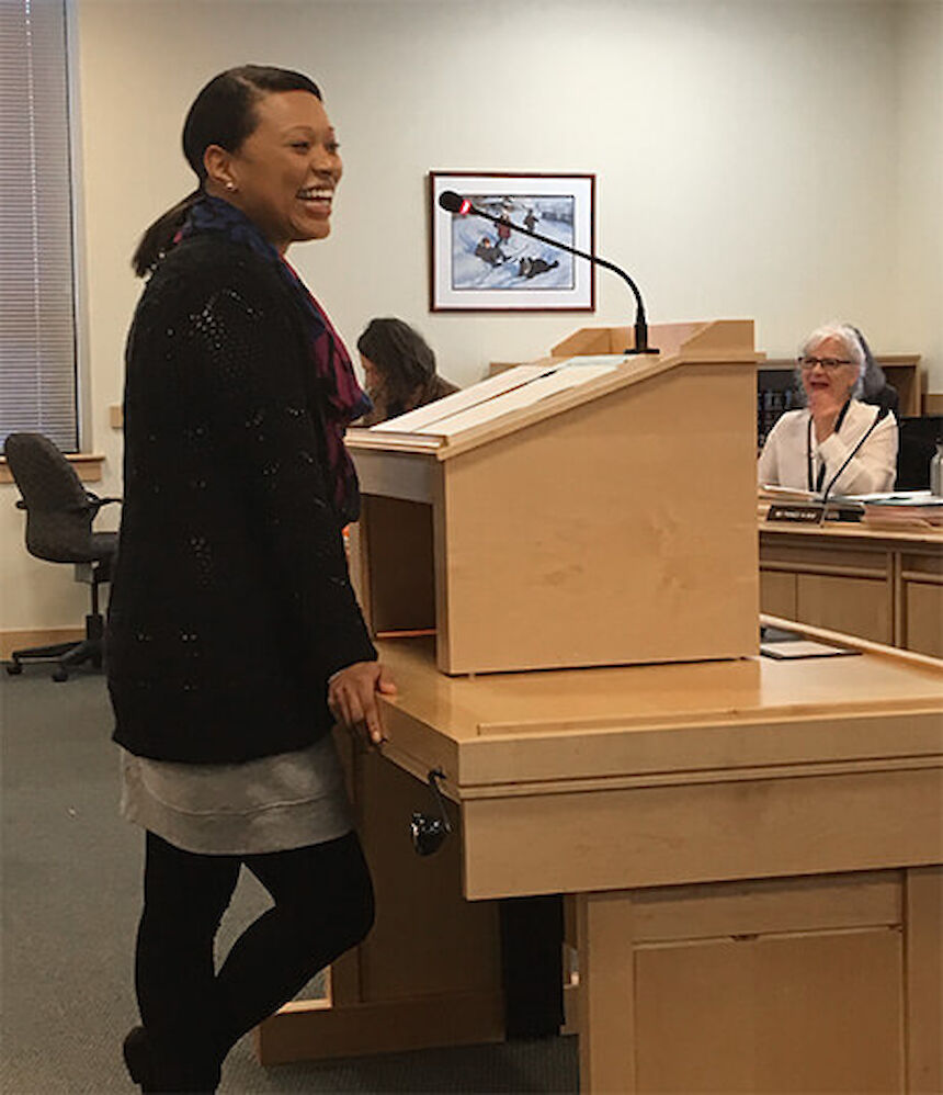 Flavia Oliveira, a member of the Equal Justice Partners' Circle and an Educare Parent Ambassador alumni, testifies in support of LIFT before the Health and Human Services Committee.